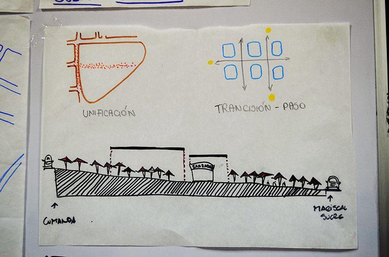 Após uma longa conversa da equipe concluímos que seria importante considerarmos a posição da liderança, caso não o fizéssemos, nós estaríamos impondo uma situação incontrolável. Estávamos sem uma resposta, em crise com a arquitetura, com a cidade de Quito, com o Mercado de San Roque e com a Calle Loja.