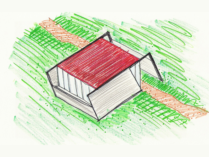 Na versão de telha metálica foram pensados como estrutura pórticos de aço, sobre os quais o revestimento acontece por telhas metálicas. Os espaços da cozinha, sala de jantar/estar e banheiro se integram num mesmo nível, ao contrário que o dormitório se encontra um nível a baixo, em conexão com a varanda. Nesse projeto, trabalhado sobre um terreno de grande declividade, a proposta é a mínima movimentação de terra, em coesão com a redução de custos na execução da obra.